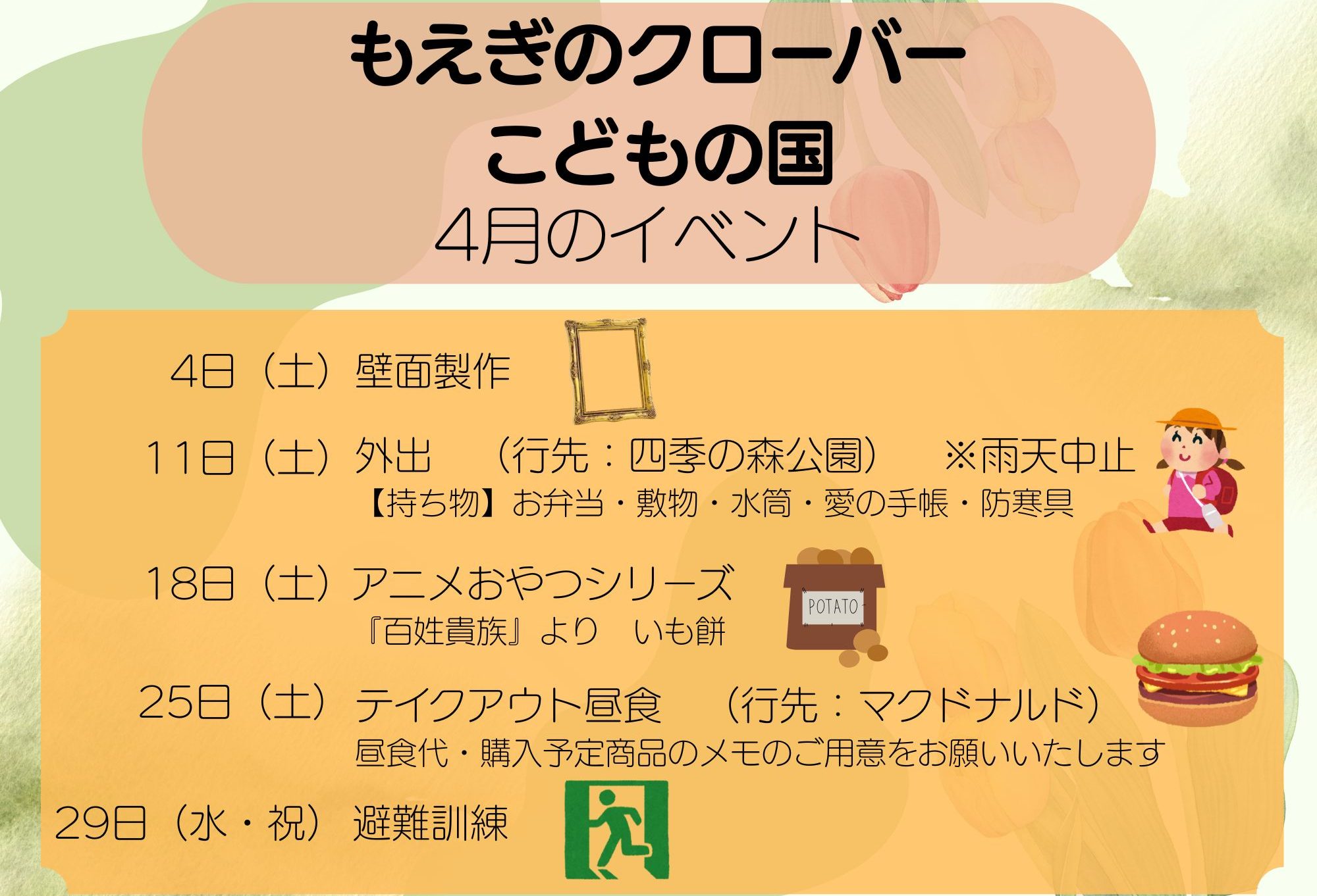 「もえぎのクローバー」では、一人一人の個性を大切に、楽しく安心できる場所づくりをしていきます。