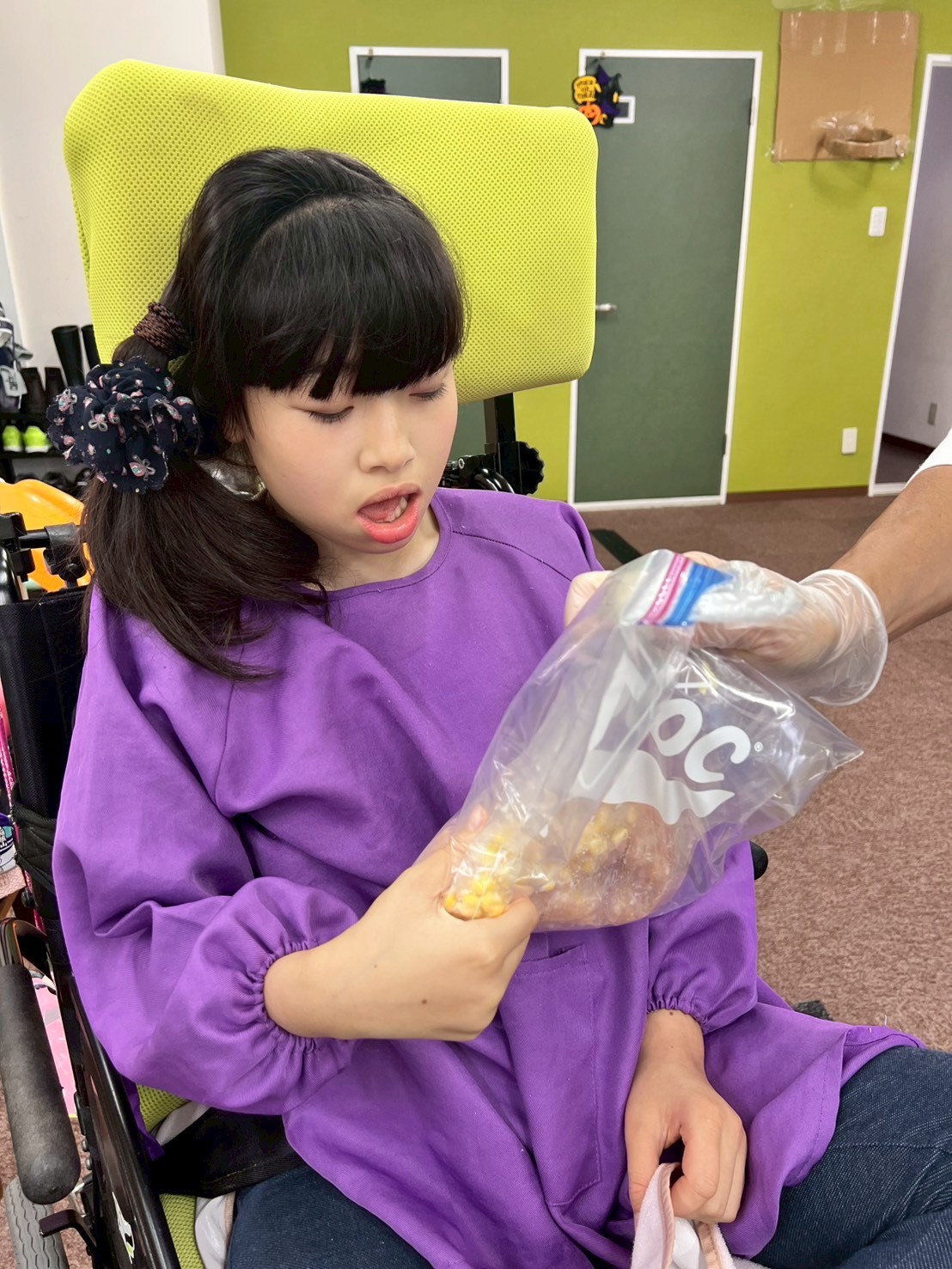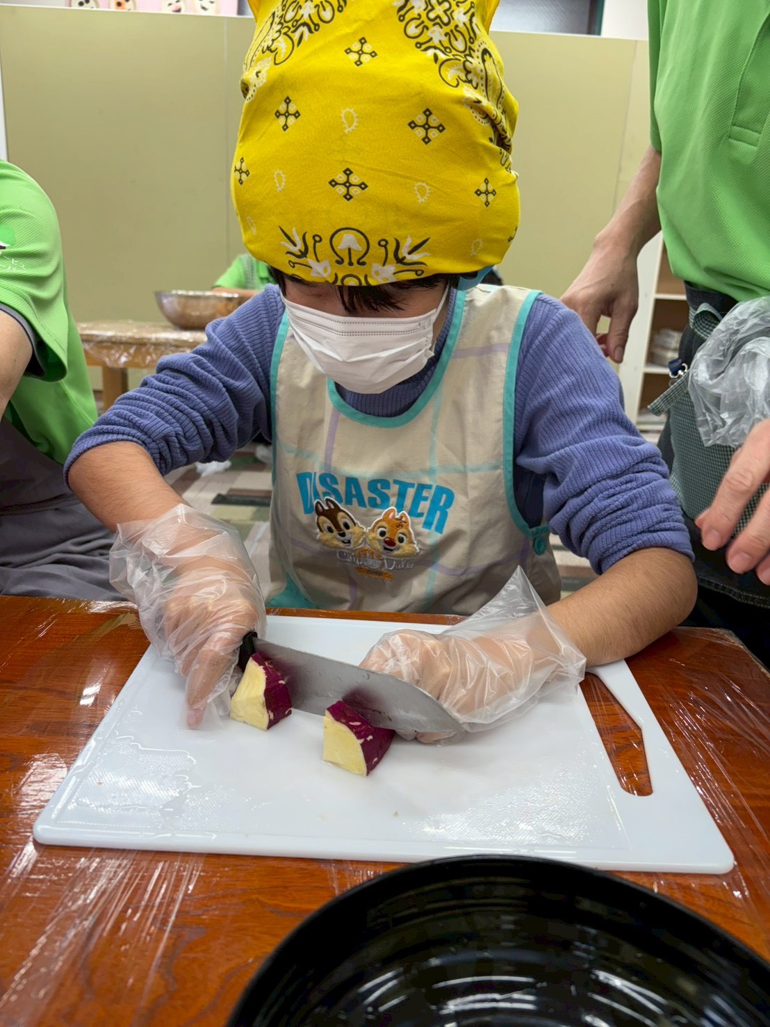 □「じょうずに切れてるかな😉」「野菜を切るの初めてだけど楽しいよ😄」