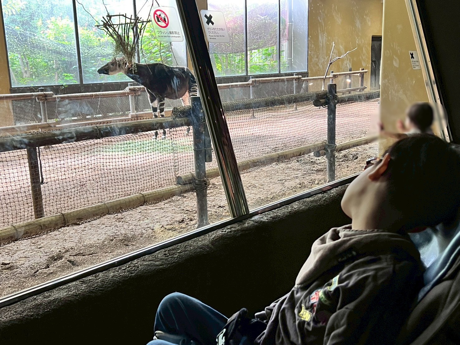 オカピはシマウマ🦓のような足をしているのでウマ🐎の仲間のように思いますが、実はキリン🦒の仲間だそうです。よく見ると角がキリンそっくりでした😊