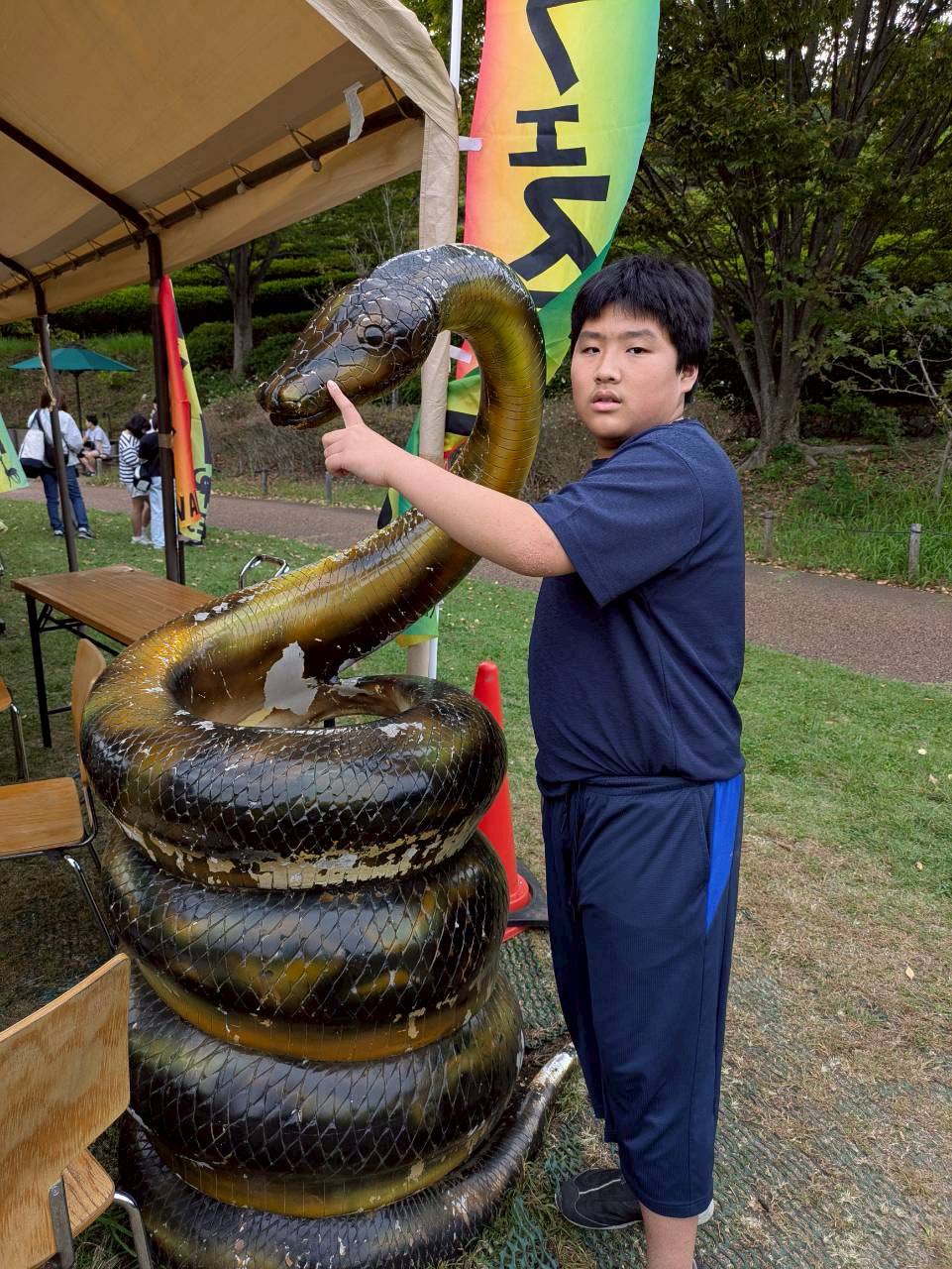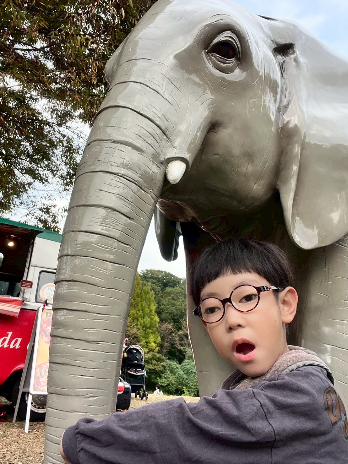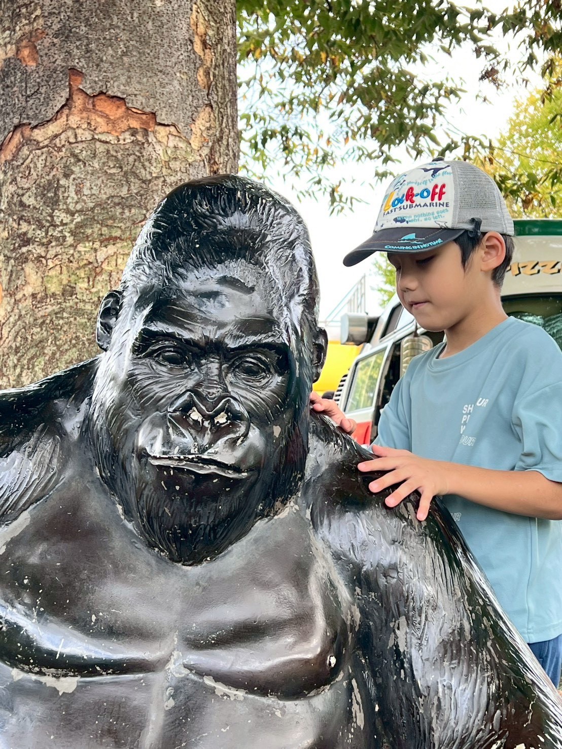 おやつ休憩をした広場に、ゾウ🐘、キリン🦒、ゴリラ🦍、クジャク🦚、ヘビ🐍の像がありました。みなさんはどの動物と一緒に写真を撮りたいですか?