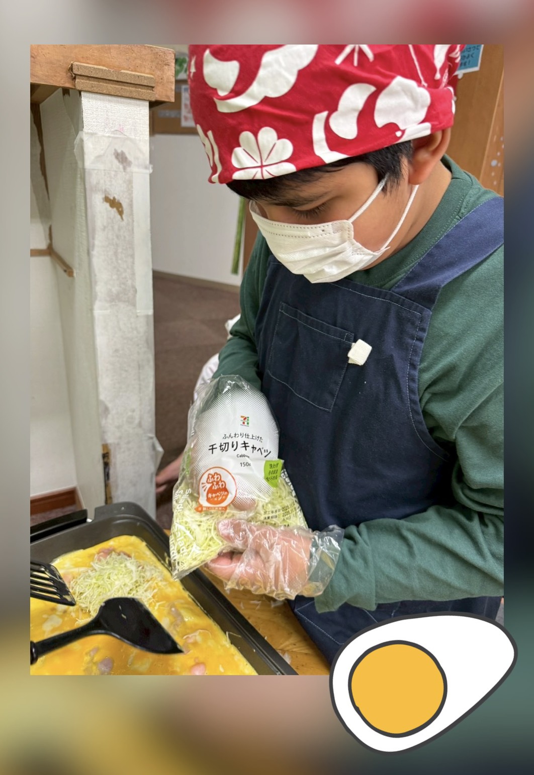 ベーコンを焼き、その上にたまご、千切りキャベツの順番で乗せていきます🥬