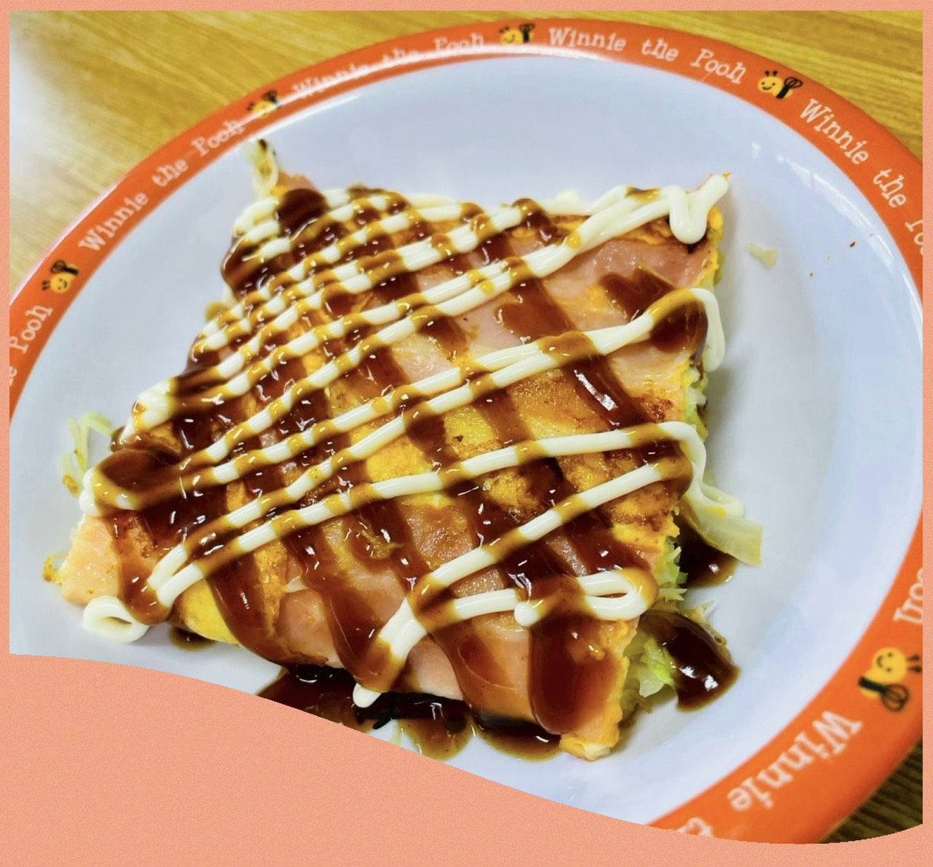ソースと、マヨネーズをかけたら、とん平焼きの完成!