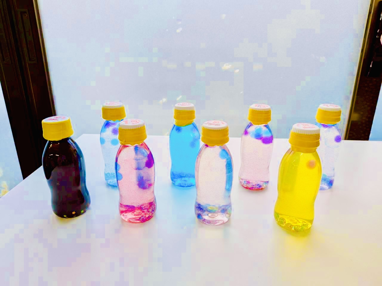 完成したボトルはゆっくり傾けるたびに、ラメやビーズがゆらゆらと動き、子どもたちは「きれい!」「ゆっくり動いてる!」と目を輝かせて見つめていました。