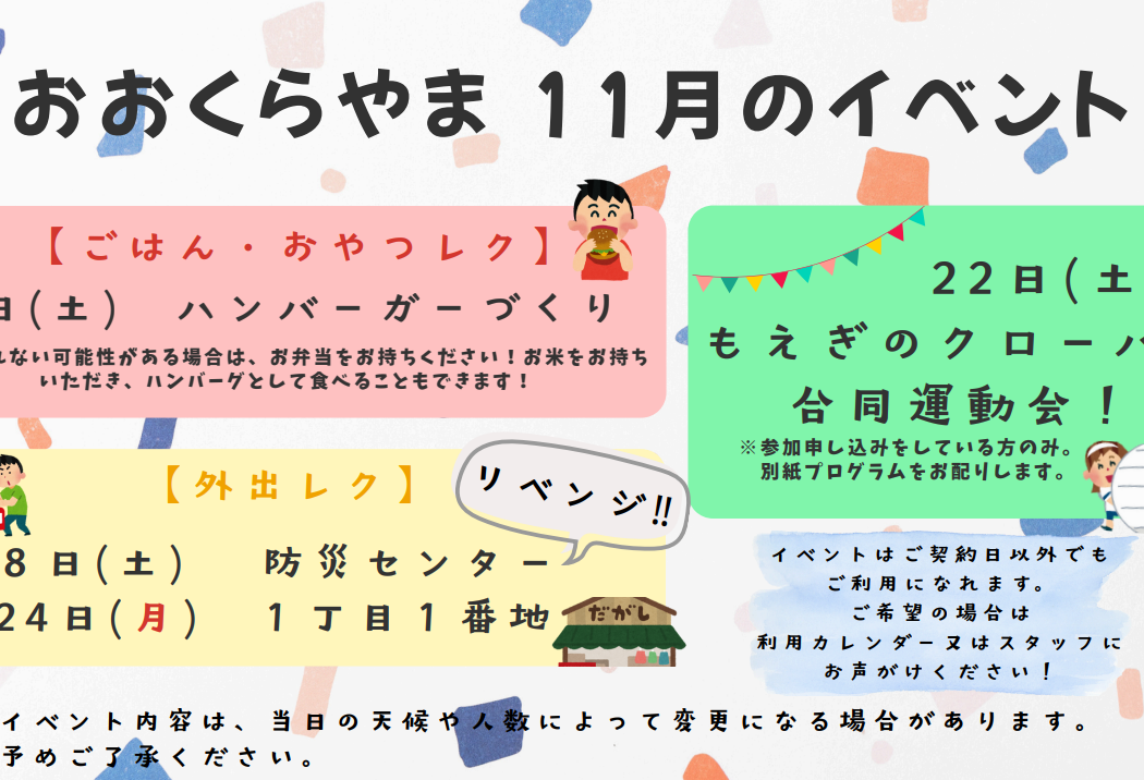 | 事業運営に関するお知らせ | もえぎのクローバーおおくらやまの支援プログラム もえぎのクローバーおおくらやま運営規定 もえぎのクローバーおおくらやま重要事項説明書 もえぎのクローバーおおくらやま安全計画2025 |